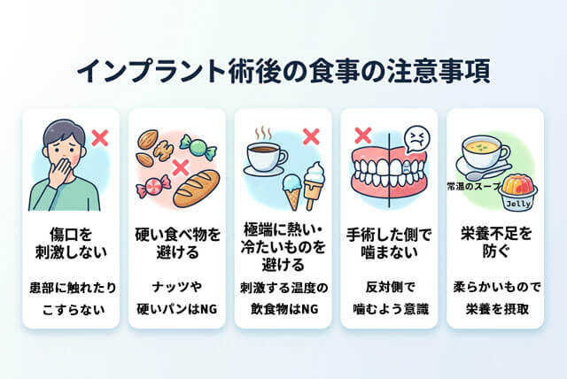 インプラント手術後の食事では、傷口に刺激を与えないこと、やわらかく食べやすいものを選ぶこと、そして栄養不足にならないことが重要です。手術当日は流動食ややわらかいものを中心にし、その後は腫れや痛みの様子を見ながら、少しずつ通常の食事へ戻していくのが基本です。